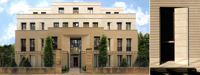 Großbürgerlichen Gründerzeitvillen standen Pate für diese moderne Interpretation einer repräsentativen Stadtvilla. Außenwände aus Terrazzo-Beton und fünf Stützen im Inneren tragen den Komplex. So ließen sich Grundrisse und Wohnungsgrößen nach den individuellen Wünschen der Käufer festlegen. Modernste Heiz- und Lüftungstechnik machen die Villa Luise auch ökologisch und ökonomisch vorbildlich.
